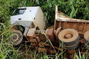 Notícias Geral BR 364 – Carreta carregada com soja tomba ao sair da rodovia – fotos 27 de março de 2018