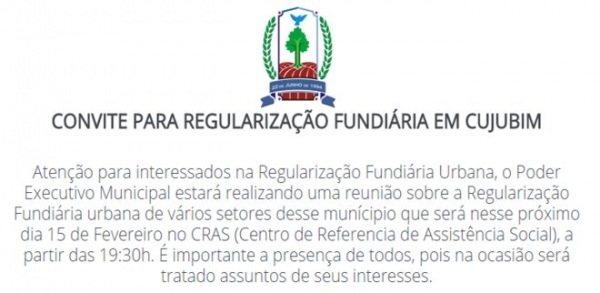 Atenção para interessados na Regularização Fundiária Urbana, o Poder Executivo Municipal estará realizando uma reunião sobre a Regularização Fundiária urbana de vários setores desse munícipio que será nesse próximo dia 15 de Fevereiro no CRAS (Centro de Referencia de Assistência Social), a partir das 19:30h. É importante a presença de todos, pois na ocasião será tratado assuntos de seus interesses.