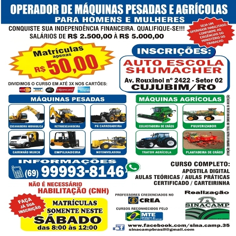 Cursos de colheitadeira de grãos, plantadeira, escavadeira hidráulica, pá carregadeira e vários outros. Inscrições R$50 Reais, somente sábado dessa semana pela manhã na Auto Escola Shumacher