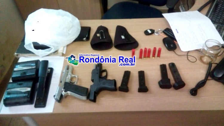 Foi dada voz de prisão aos elementos, em seguida, foi realizada uma busca minuciosa, onde embaixo do banco traseiro da caminhonete, foram encontradas duas pistolas da marca Taurus, calibre .380 e com as armas, também foram encontrados 6 cartuchos calibre 32.