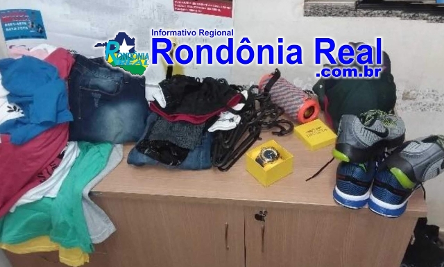 Na residência os policiais encontram: 20 camisetas de cores variadas; cinco bonés; dois pares de tênis; uma calça jeans; uma bermuda jeans; dois shorts; um relógio; uma caixa de som; 20 cabides e um par de meias, todos furtados da loja em Cujubim. Além destes objetos também foram apreendidos outros objetos de procedência duvidosa: dois aparelhos celular e nove camisetas novas com etiqueta e cabides.