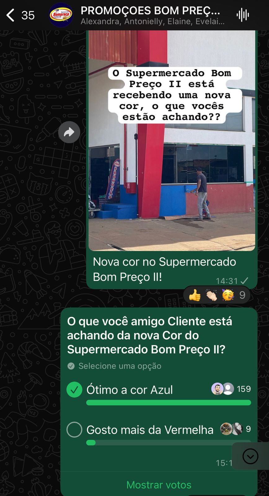 Foi Realizado no Próprio Grupo do Supermercado uma enquete, onde perguntou “O QUE VOCÊ AMIGO CLIENTE ESTÁ ACHANDO DA NOVA COR DO SUPERMERCADO BOM PREÇO II?” e o resultado foi surpreendente, cerca de 159 pessoas escolheram A OPÇÃO (ÓTIMA A COR AZUL), enquanto 9 clientes escolheram a opção (Gosto mais da vermelha”.