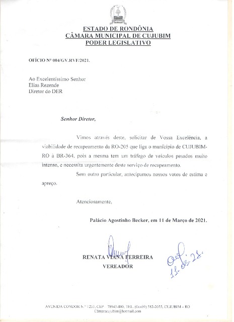Na oportunidade, a Legisladora Municipal, Renata Viana apresentou um oficio onde teve o objetivo de reivindicar o recapeamento da Rodovia 205, que liga o Município de Cujubim há BR-364. Renata justificou seu pedido uma vez que a mesma tem um alto volume de trafego de veículos, e a situação precária da Rodovia vem lhes trazendo prejuízos em seus veículos.