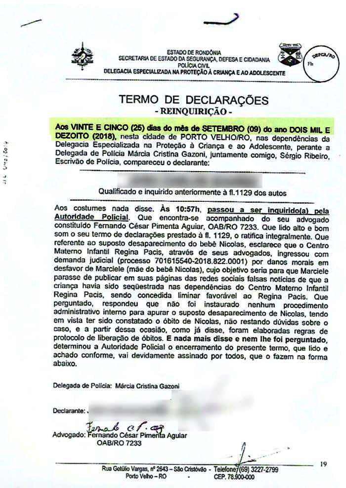 “Isso significa dizer que a Requerente [hospital Regina Pacis] ainda está sendo investigada pelo desaparecimento de Nícolas Naitz, filho da Requerida, pela Polícia Civil do Estado de Rondônia, assim como os demais envolvidos”, sacramentou destoando às alegações dos representantes da instituição hospitalar.