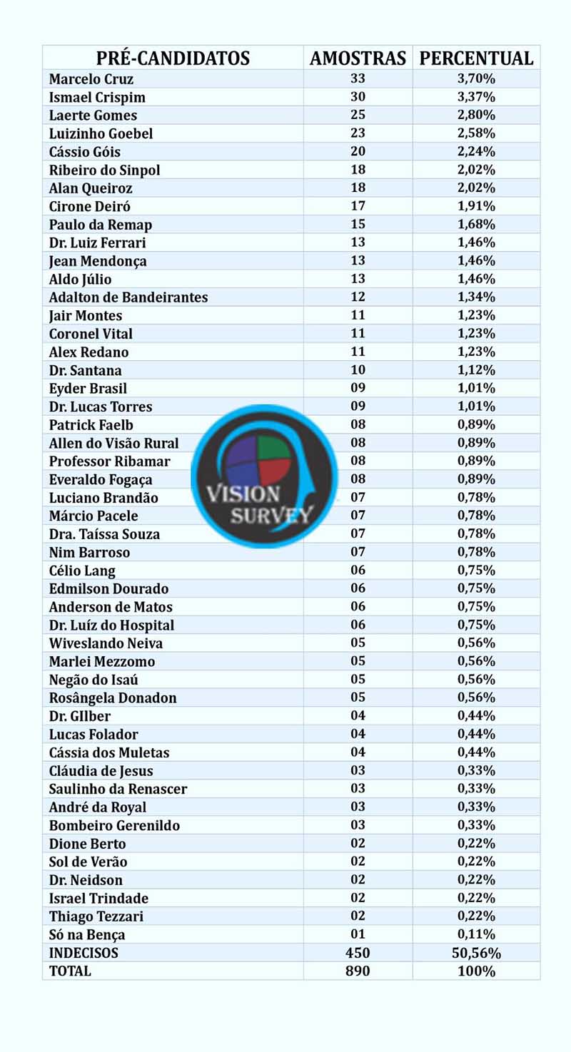 Segundo a pesquisa, os primeiros colocados são: Marcelo Cruz (3,70%), Ismael Crispim (3,37%), Laerte Gomes (2,80%), Luizinho Goebel (2,58%), Cássio Góis (2,24%), Ribeiro do Sinpol e Alan Queiroz (2,02%), além de Cirone Deiró (1,91%).